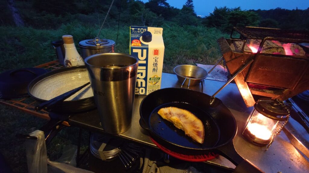 炭火で焼いてもいいのですが、大きすぎて周辺まで火が通る頃には中心部が焼け焦げてしまいそうなので、スキレットで蒸し焼きにすることにします。