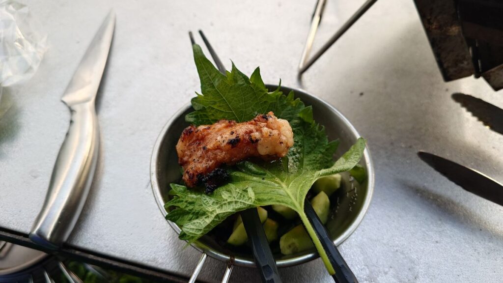 シソの葉が手に入ったので焼けた肉を来るんで食べます。
