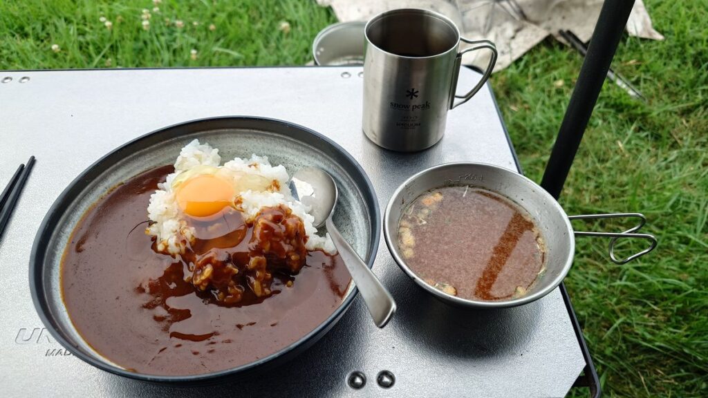 カレーに卵を落としオニオンスープを添えていただきます。この日は、全く結露がなく、気持ちよく乾燥撤収できました。