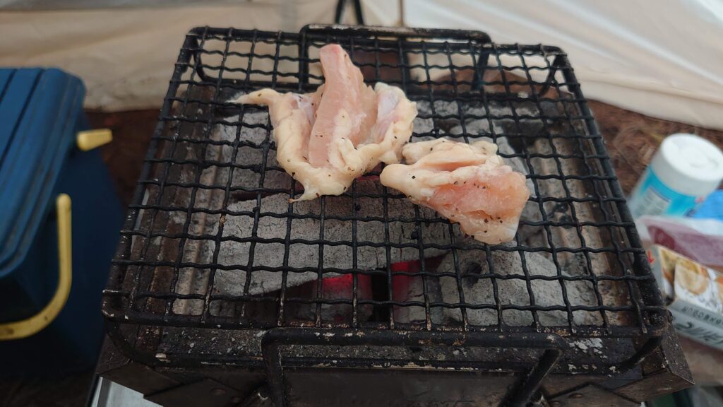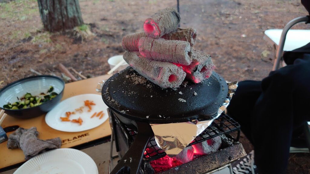 炭は、下少なめの上多めがいい感じです。このときは、下が多めで焦げてしまいましたが^^;