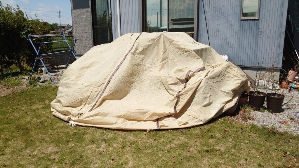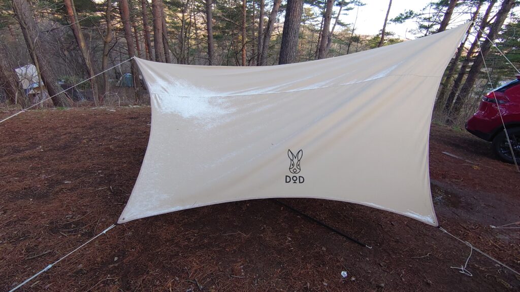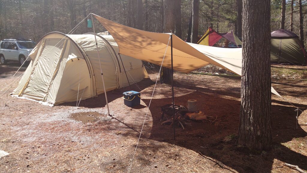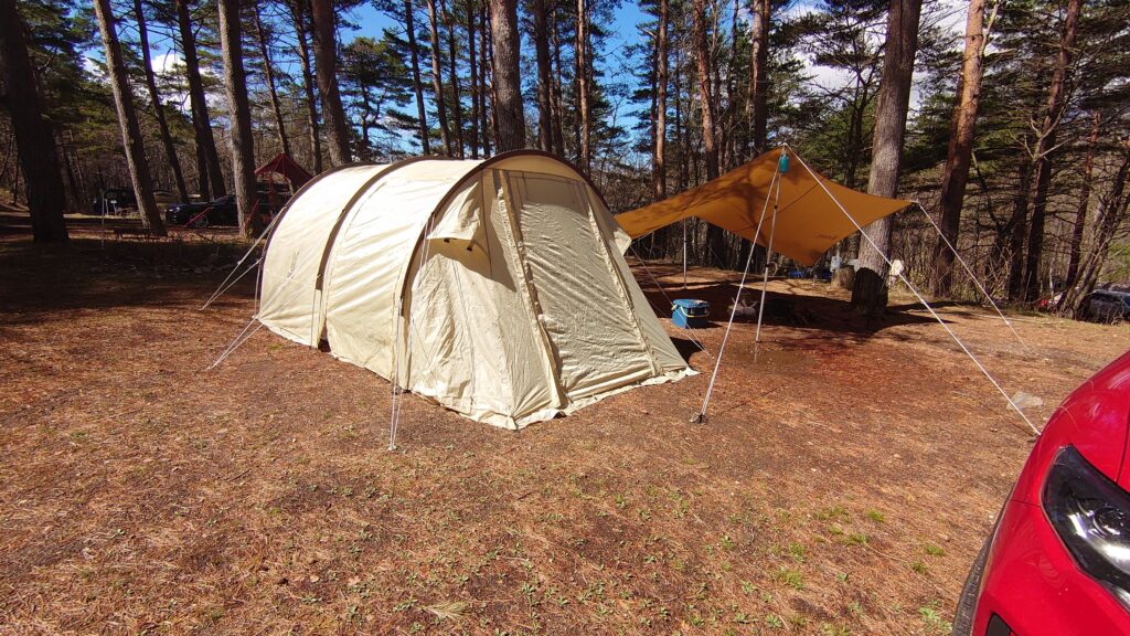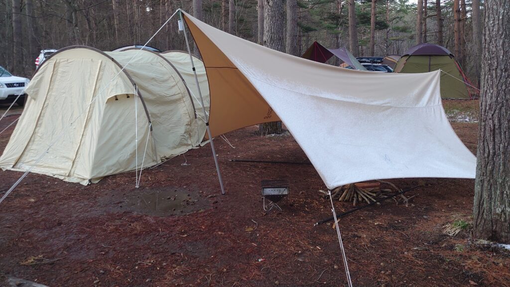 今回は、ソロカマやツーリングドームでは手狭なので、少し余裕のあるDODカマボコテントminiを張ることにしました。前室もそこそこ広いので、寒くなったら中に移動することもできますし^^;