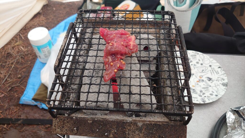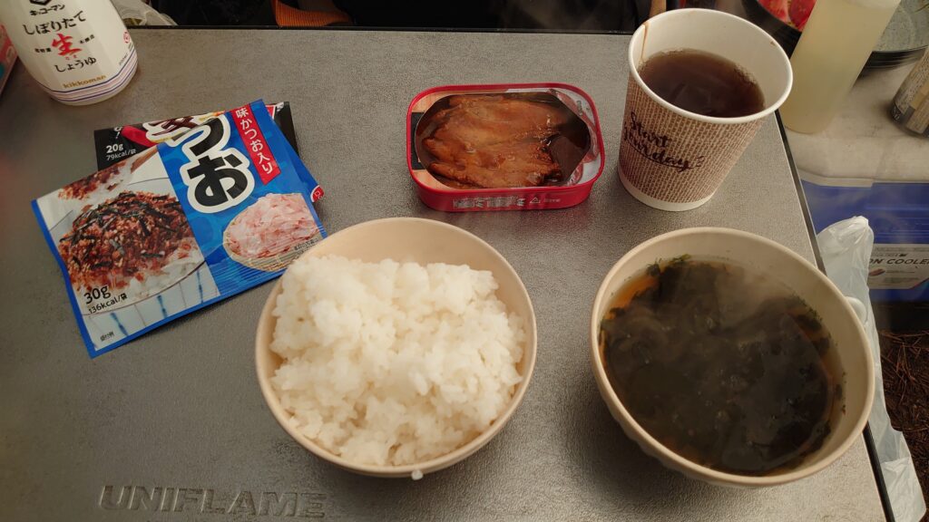 ツツジの湯に寄り、温泉で温まってキャンプ場に戻れば、お待ちかねの宴のお時間です。時刻は15時半頃ですが、既に雨が降り始めており、テントの外は5℃を下回っています。