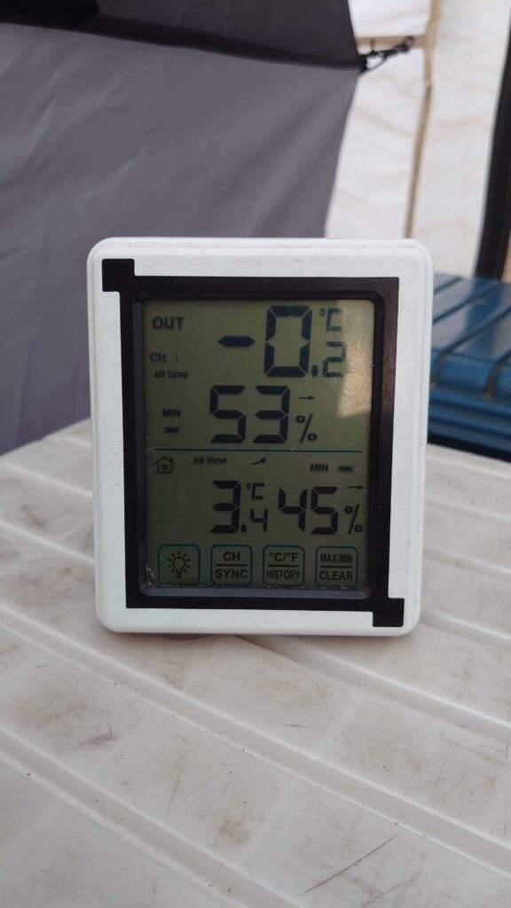 最低気温はと言うと、-0.2℃でした。冬装備で来ていたので、寒さはしのげましたが、乾燥撤収は難しそうです。大きめなテントを使った分、家でのメンテが少し憂鬱です。