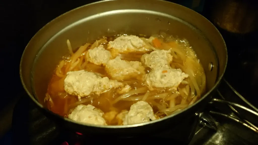 ある程度野菜に火が通ってから鳥つみれを投入します。