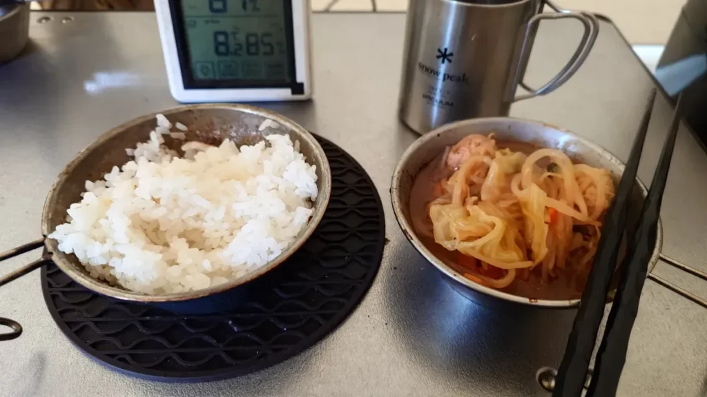 6時前に起床。石油ストーブで暖を取りながらコーヒーを淹れ朝食の準備をします。前日早く休んでしまったせいで、鍋の中身がほとんど残っています。新しいおかずを作ってしまうと多すぎるので鍋の残りで済ますことに。ご飯も久しぶりにシェラカップで炊くことにしました。