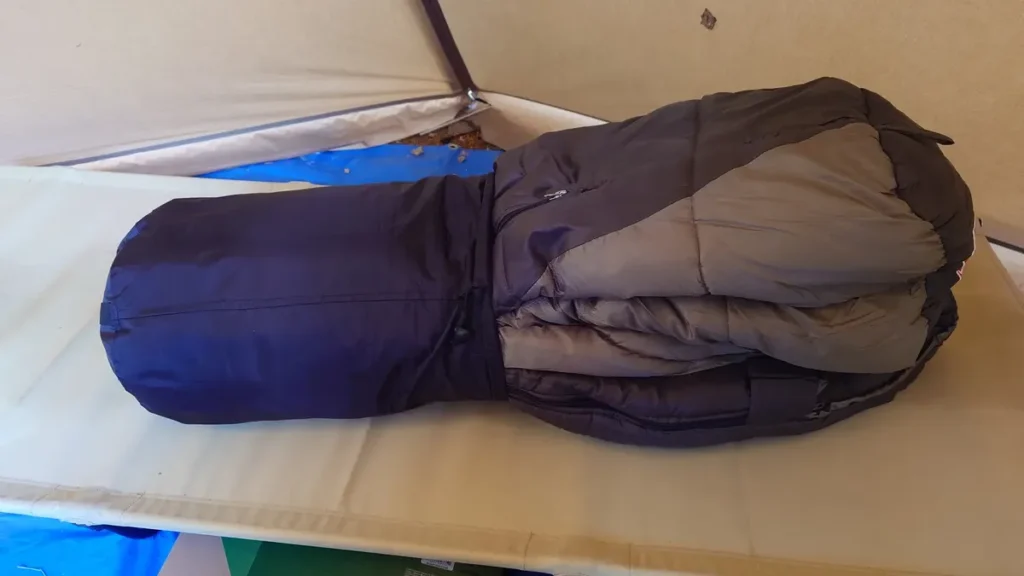 翌朝の寝袋収納の様子です。このボリュームのある寝袋が、果たしてちゃんと袋に収納できるのか?