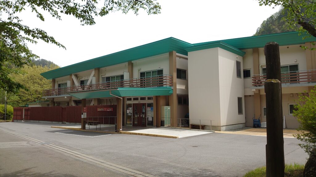 キャンプ場の受付は、キャンプ場よりも数100m先の国民宿舎かじか荘で行っています。受付は、予約時に伝えた連絡先や人数などが記載された伝票ができあがっており、内容を確認してサインするだけですみます。公園の利用料が一人300円と、テント一張り1560円のあわせて1860円でした。タープを張る場合は別に一張り分1560円がかかるので、今回はテントのみにしました。