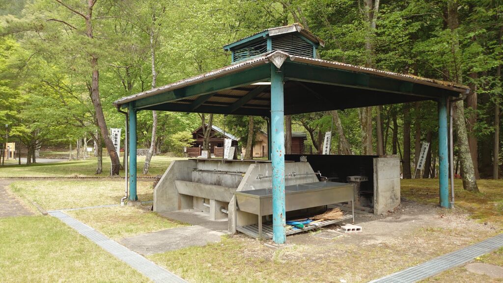 テントサイトの東寄りに水場があります。水道の他に、かまどと灰捨て場がありました。隣に、BBQ用の屋根付きスペースもあります。