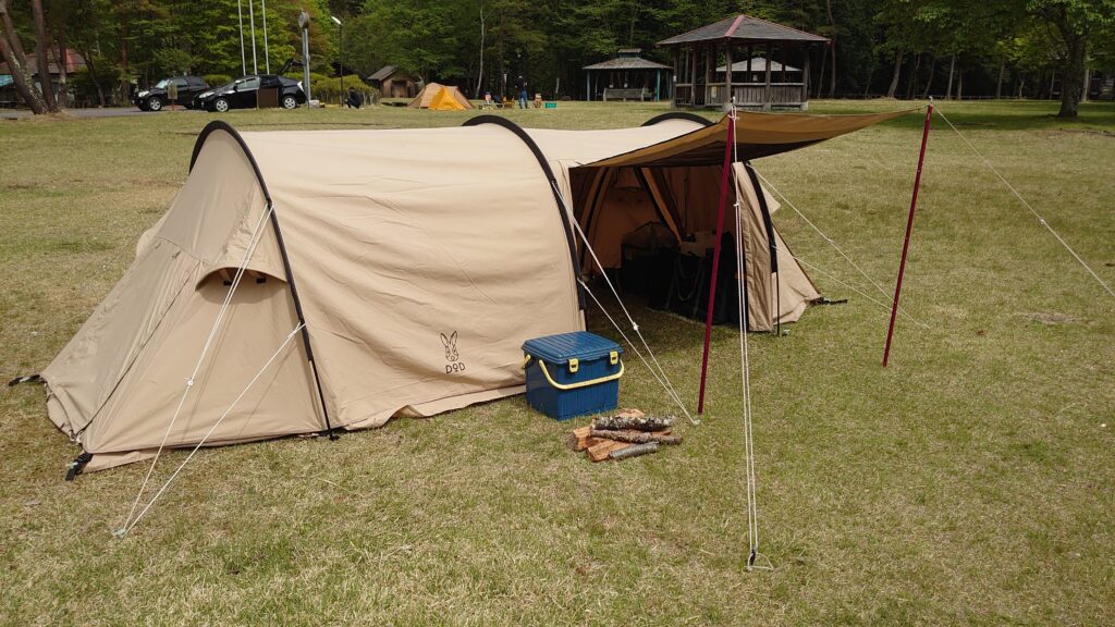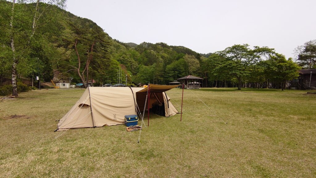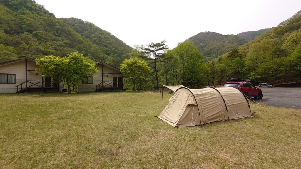 この日こちらを利用したキャンパーは、自分を含めて4組だけでした。車の乗り入れはできませんが、空いているので、駐車場の近くに設営しても静かに過ごせそうなので、車をとめたすぐ側で設営を始めます。