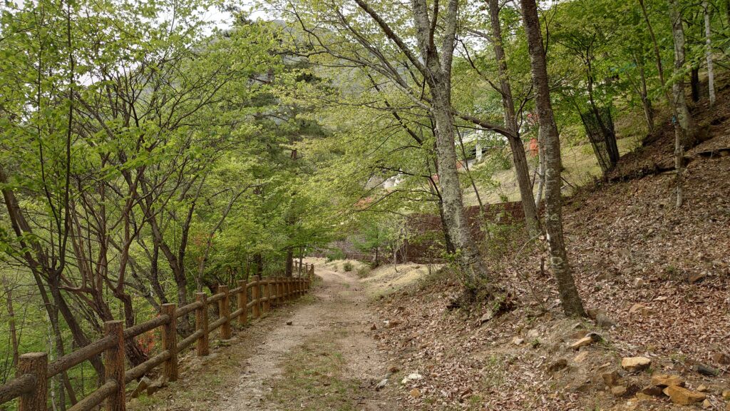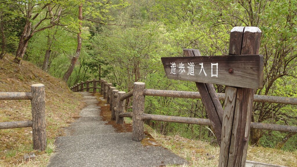 そこで、公園から川沿いを歩き、少し上流を目指してみます。遊歩道右手斜面の上に見えるのは、かじか荘です。