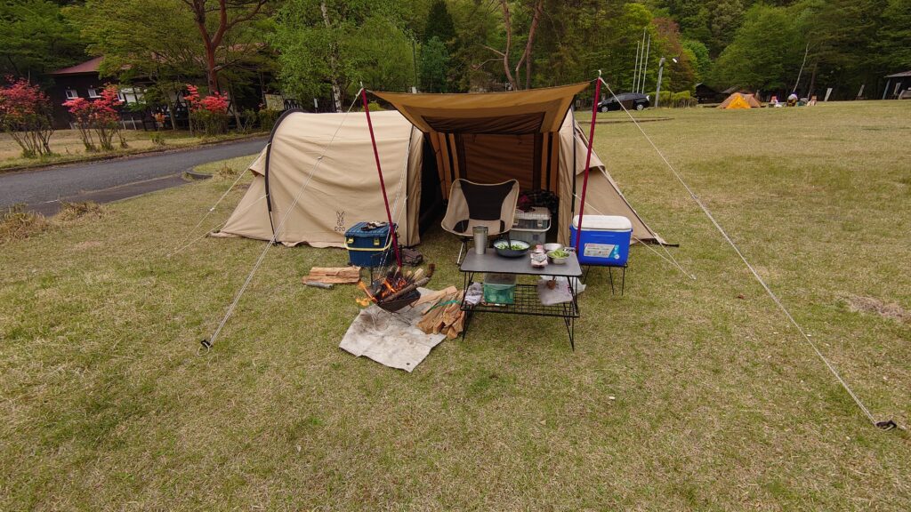 天気予報では、晴れて暖かくなる予報だったので、テントのみで過ごすことにしました。日除けにタープも張りたい気持ちはありましたが、タープ一張りでプラス1560円はちょっと大きいかな^^;結局終日薄曇りで、強い日差しに悩まされることは無かったので、結果オーライでしたが、この先日差しが強くなる季節には張りたいですね。