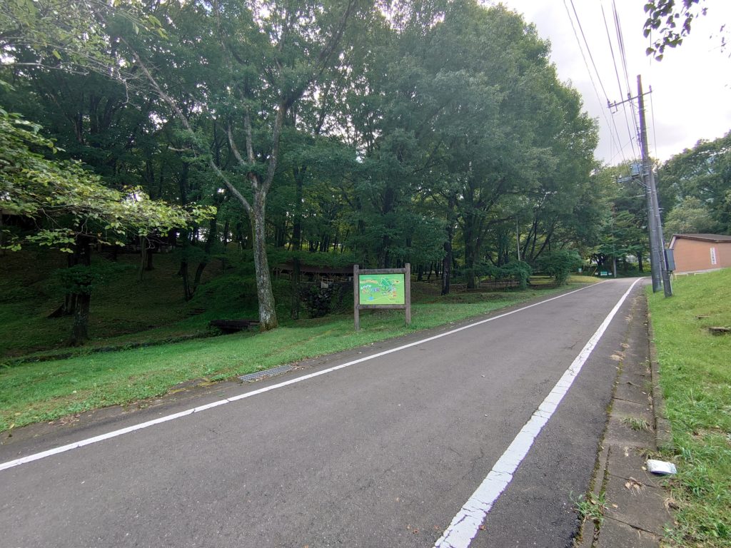 管理棟から車でフリーサイトへ向かいます。左側に見える看板がキャンプ場の案内板です。右手にある茶色建物は、ゴミの収集所です。